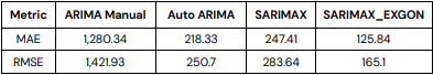 - SARIMAX models achieved the lowest RMSE (165.10), outperforming ARIMA and Auto ARIMA by accounting for seasonality and promotions.